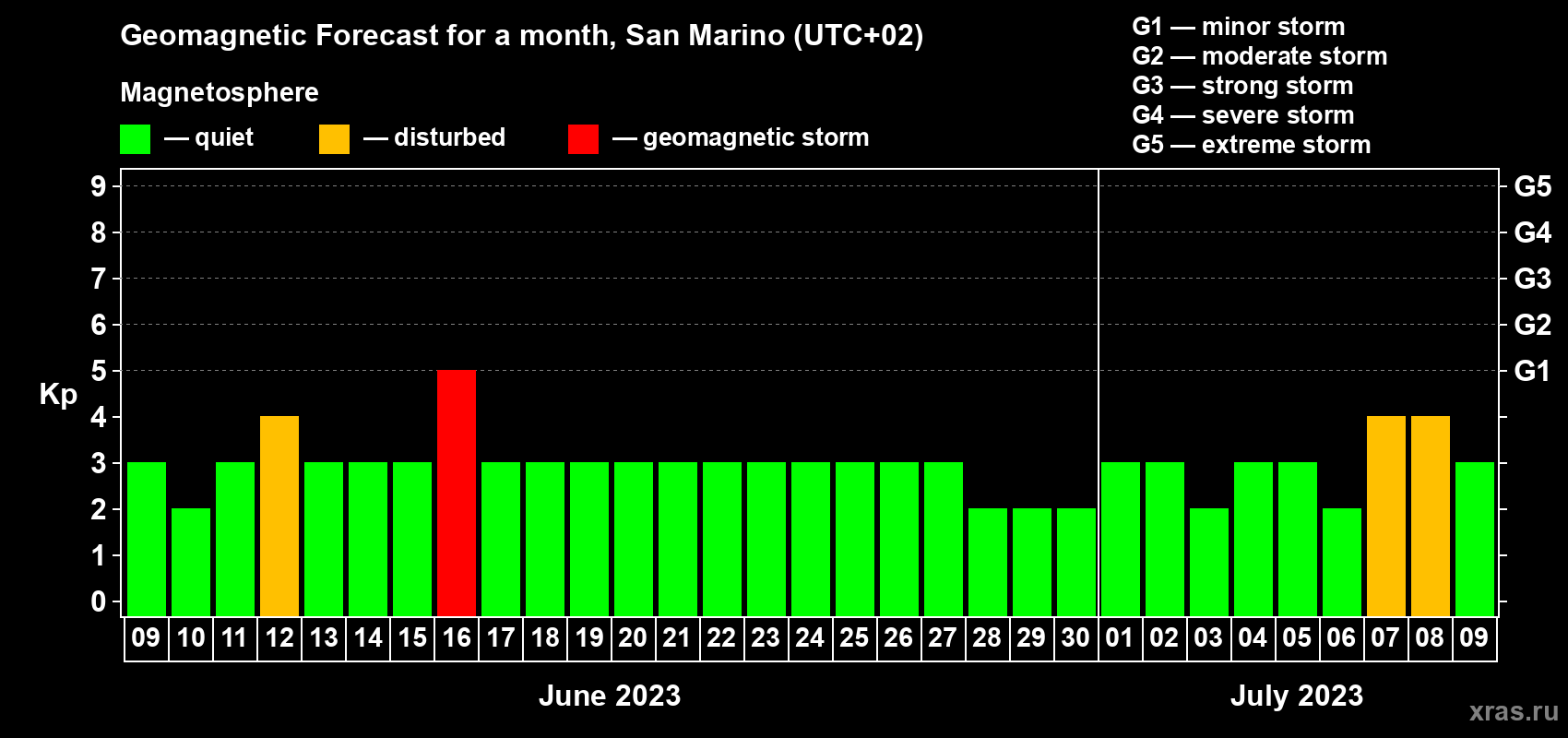 Geomagnetic storm forecast in San Marino for Jun 09, 2023