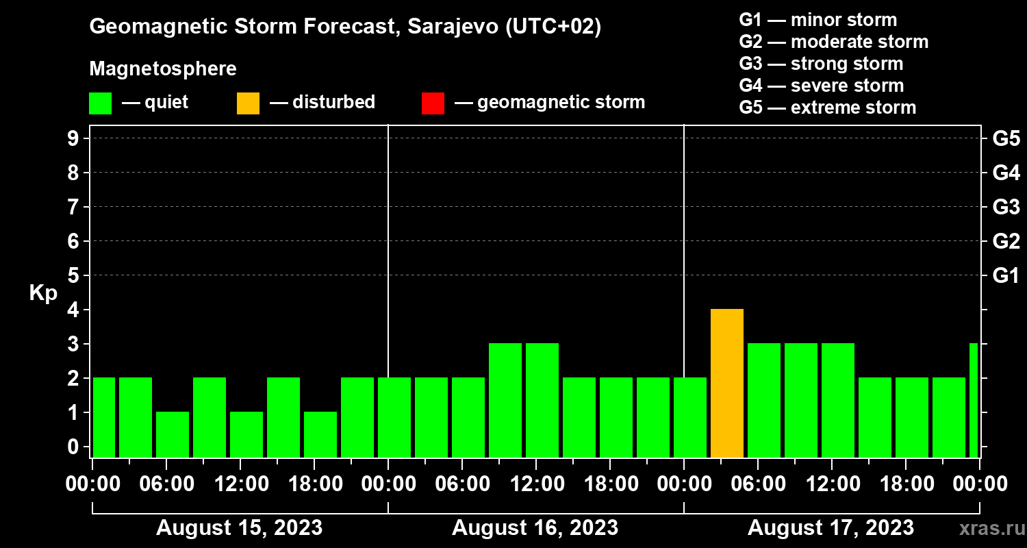 Geomagnetic storm forecast in Sarajevo for Aug 15, 2023