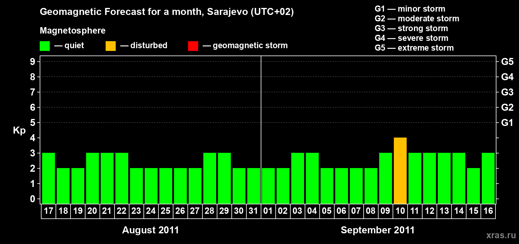 Geomagnetic storm forecast in Sarajevo for Aug 17, 2011