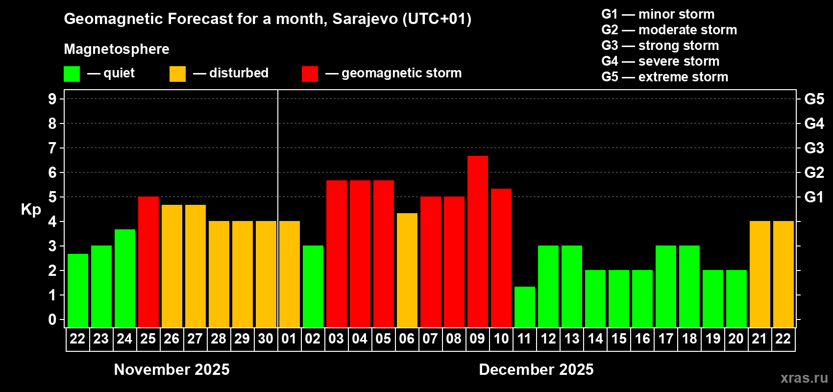 Geomagnetic storm forecast in Sarajevo for Nov 22, 2025