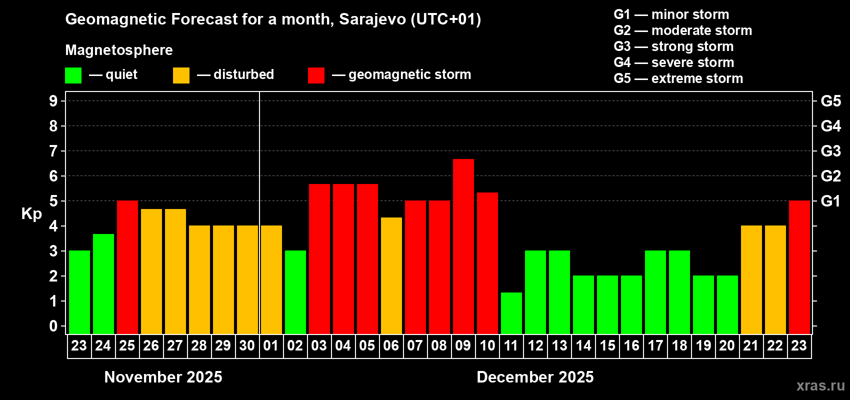 Geomagnetic storm forecast in Sarajevo for Nov 23, 2025