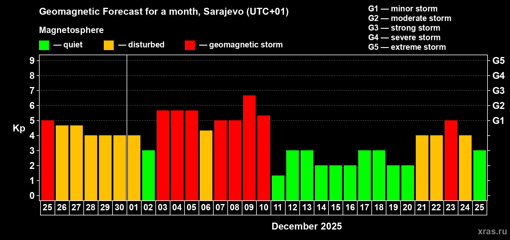 Geomagnetic storm forecast in Sarajevo for Nov 25, 2025