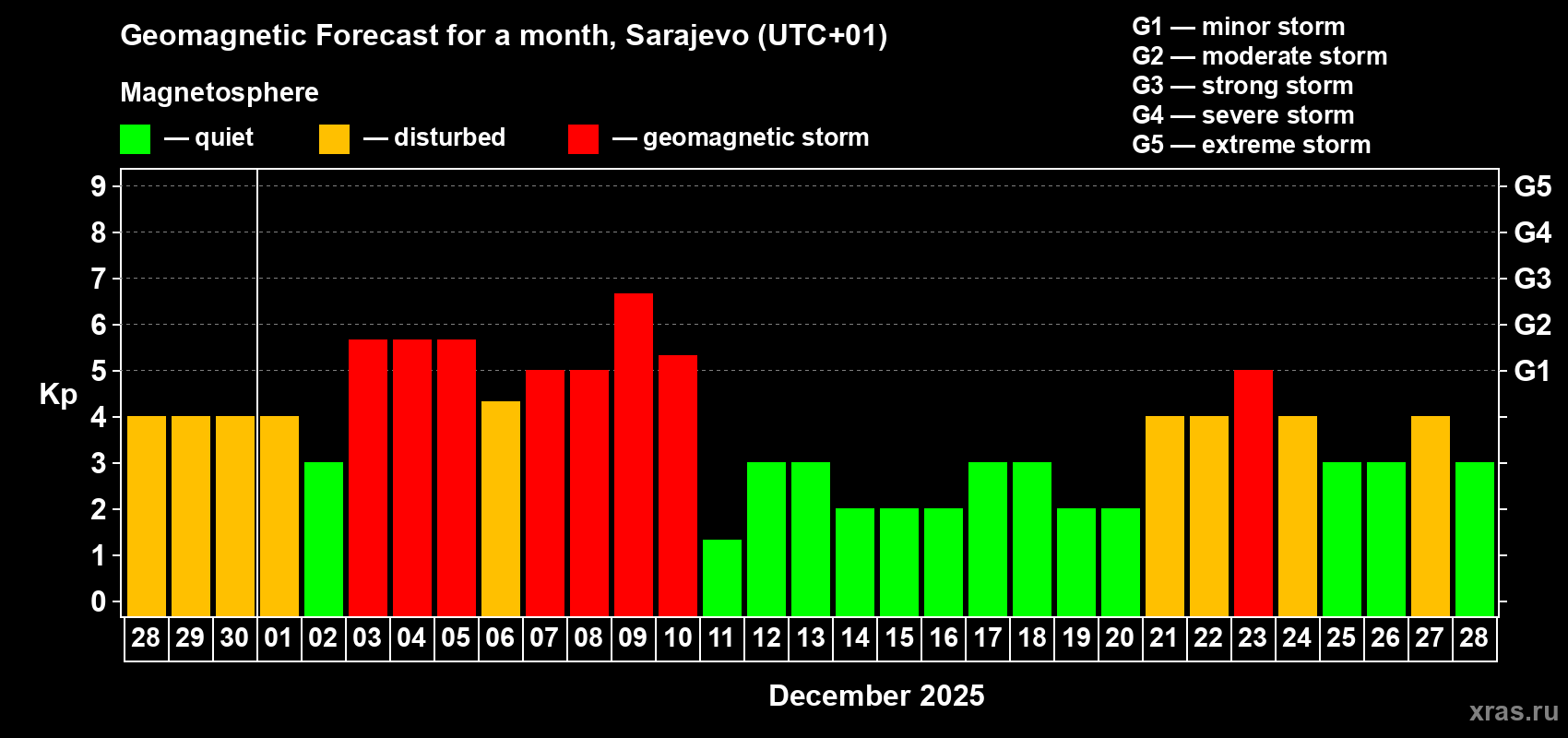 Geomagnetic storm forecast in Sarajevo for Nov 28, 2025