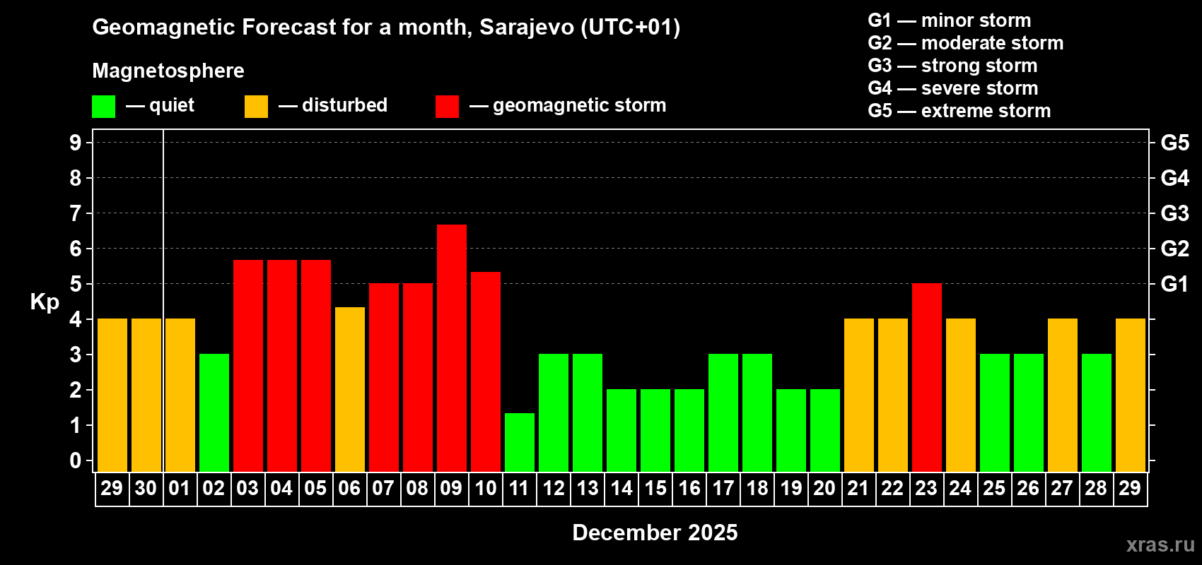 Geomagnetic storm forecast in Sarajevo for Nov 29, 2025
