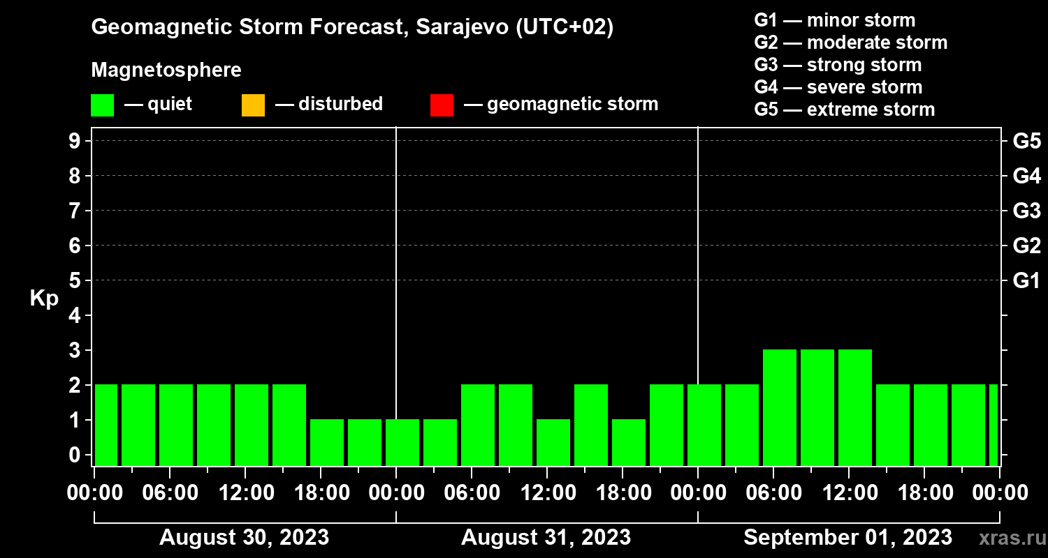 Geomagnetic storm forecast in Sarajevo for Aug 30, 2023