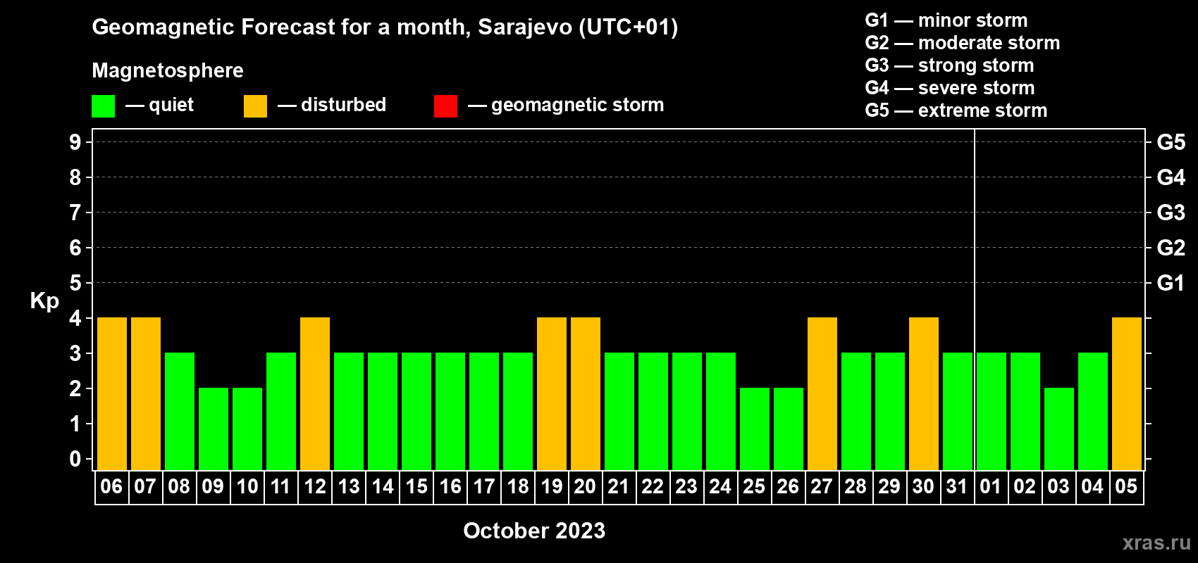 Geomagnetic storm forecast in Sarajevo for Oct 06, 2023