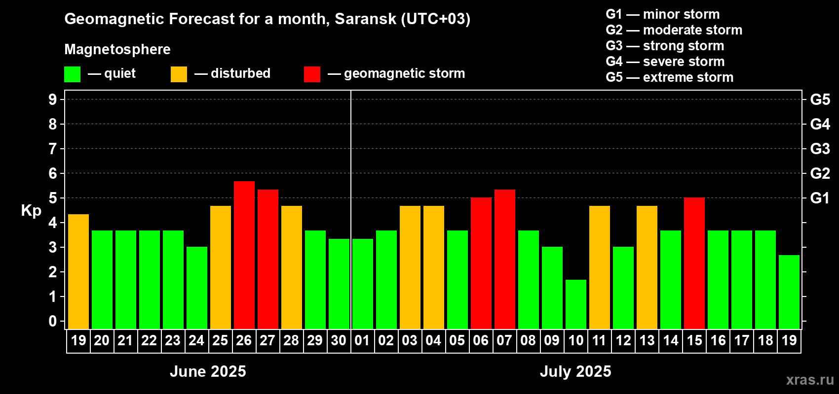 Geomagnetic storm forecast in Saransk for Jun 19, 2025