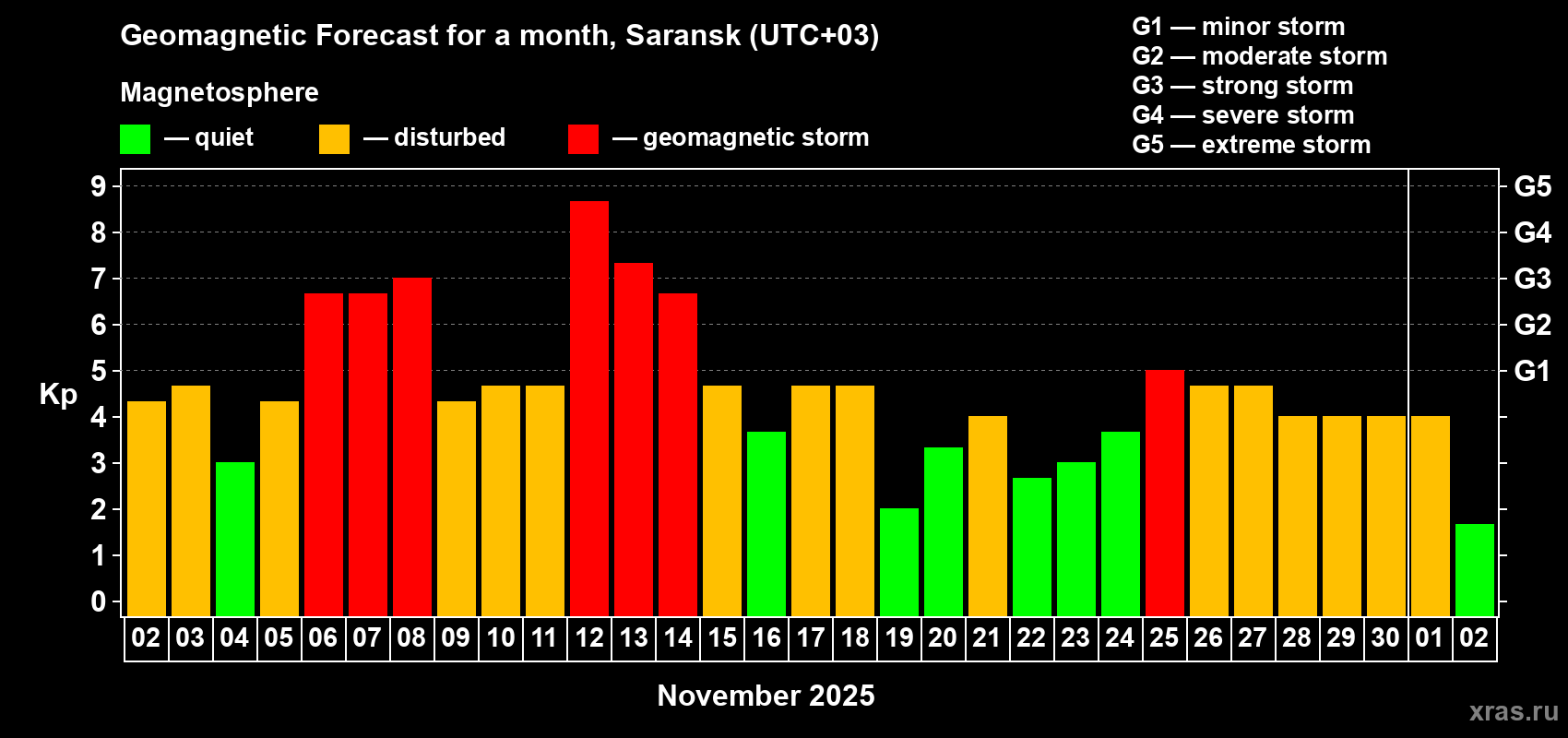 Geomagnetic storm forecast in Saransk for Nov 02, 2025