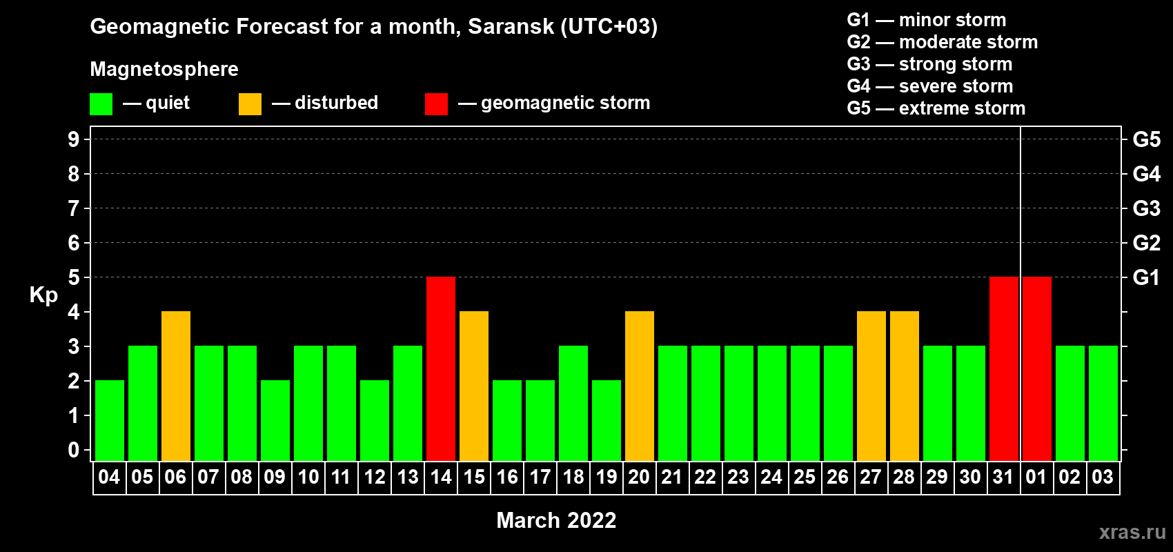 Geomagnetic storm forecast in Saransk for Mar 04, 2022