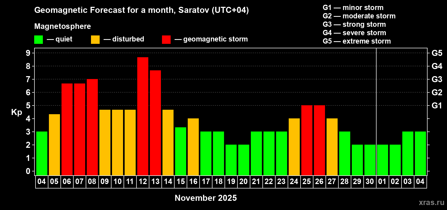 Geomagnetic storm forecast in Saratov for Nov 04, 2025