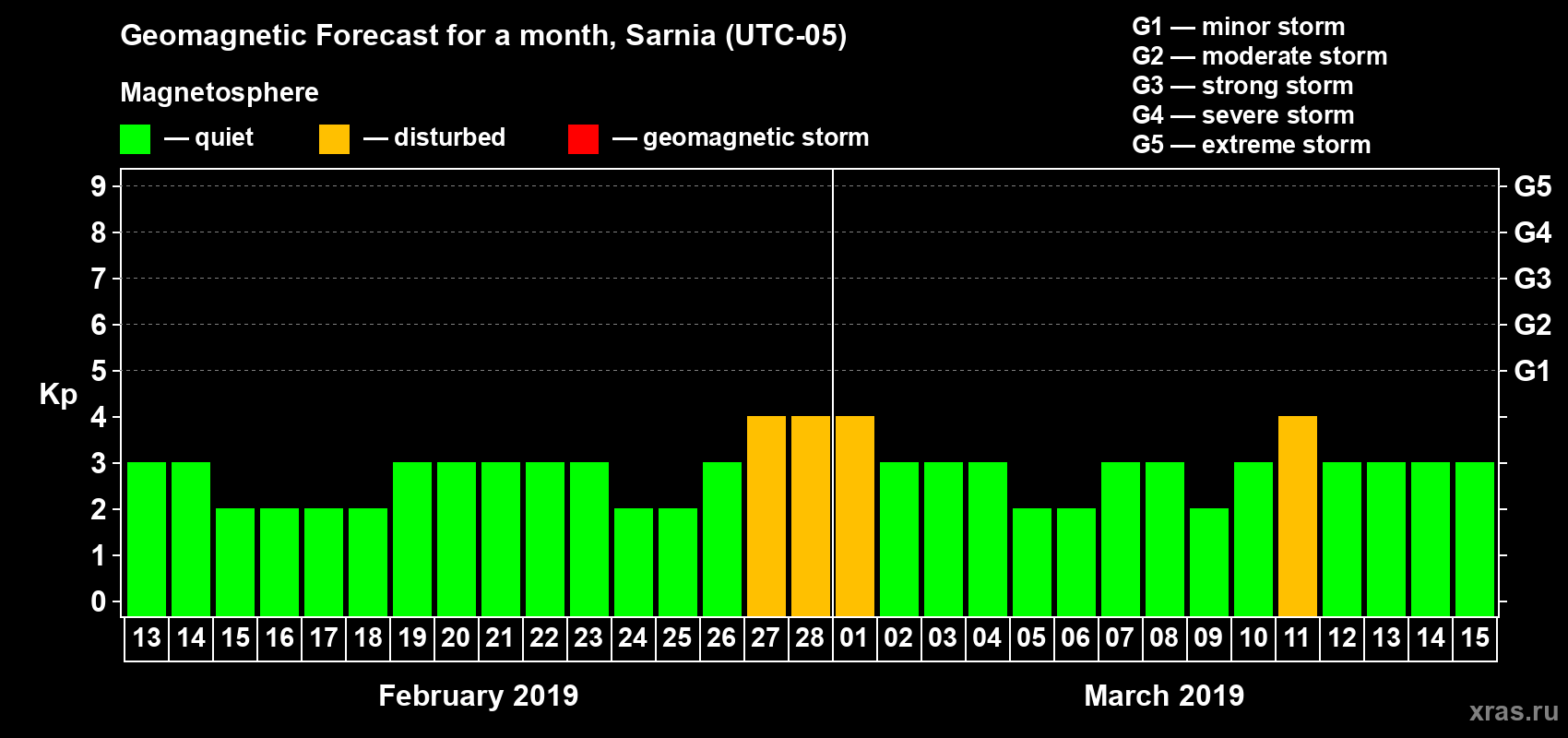 Geomagnetic storm forecast in Sarnia for Feb 13, 2019