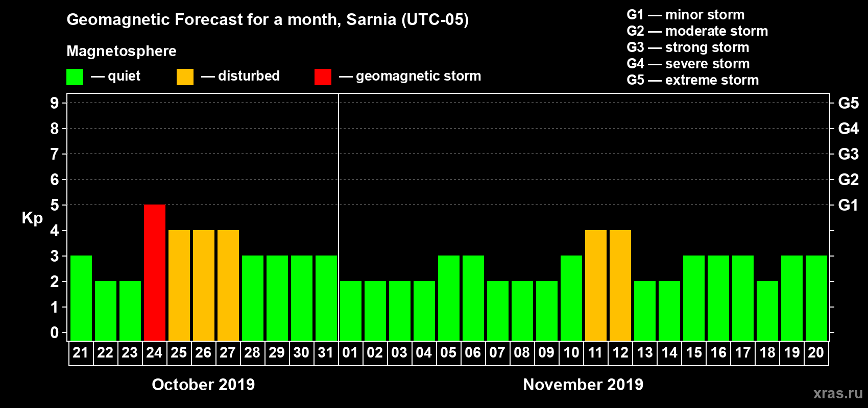 Geomagnetic storm forecast in Sarnia for Oct 21, 2019