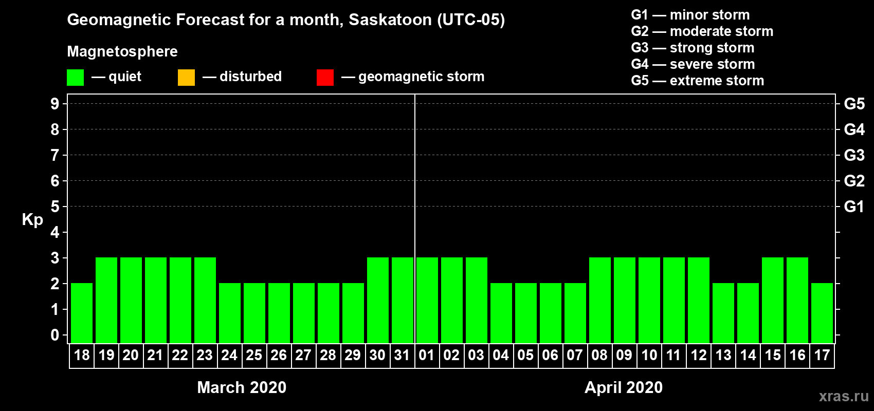 Geomagnetic storm forecast in Saskatoon for Mar 18, 2020