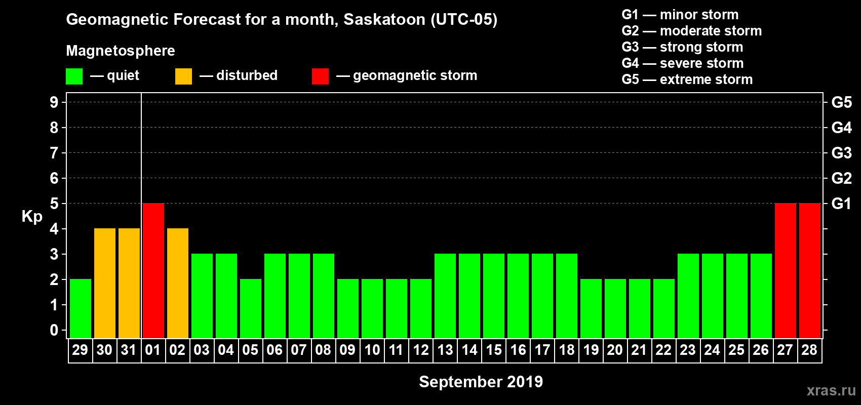 Geomagnetic storm forecast in Saskatoon for Aug 29, 2019