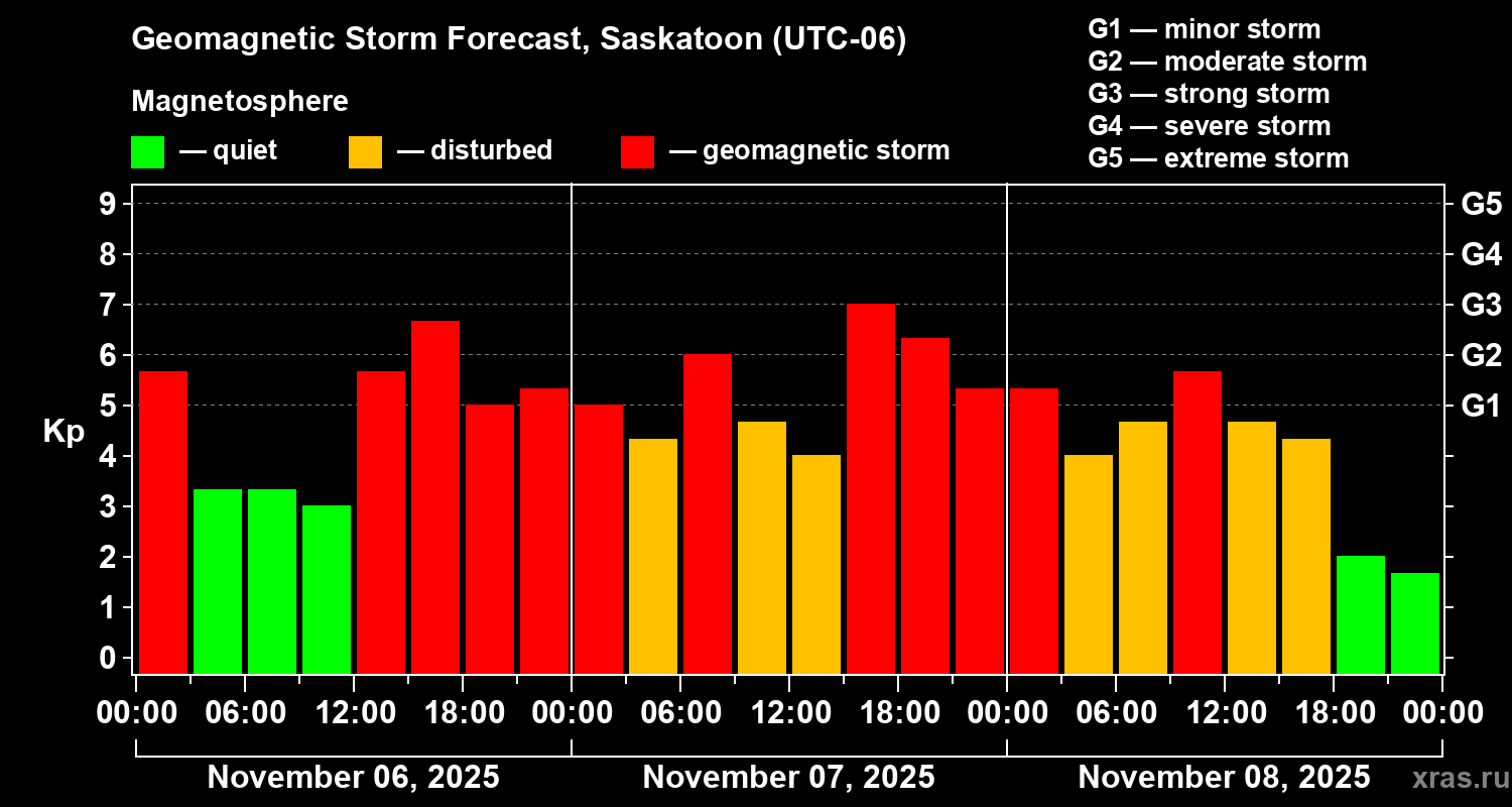 Geomagnetic storm forecast in Saskatoon for Nov 06, 2025