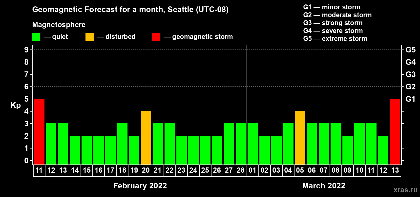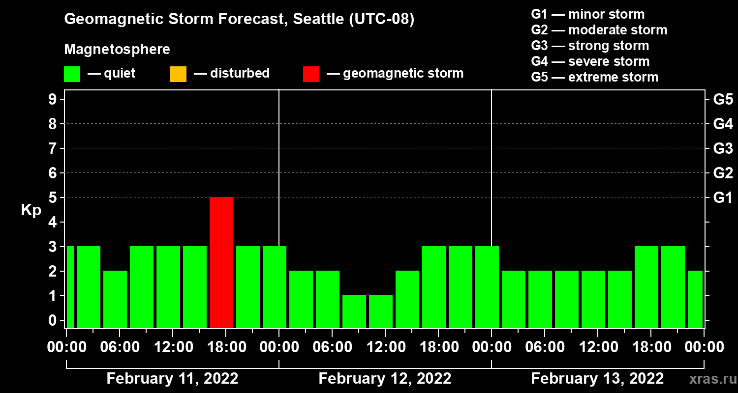 Geomagnetic storm forecast in Seattle for Feb 11, 2022