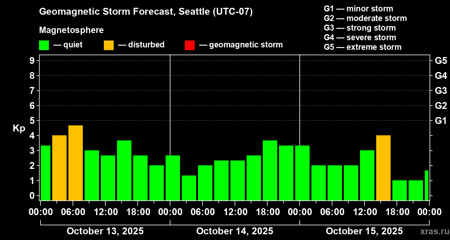 Geomagnetic storm forecast in Seattle for Oct 13, 2025
