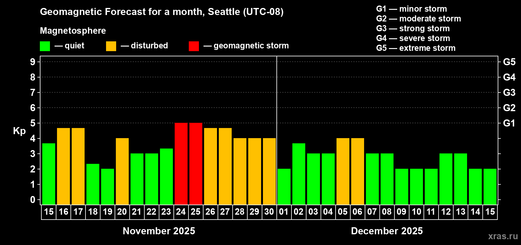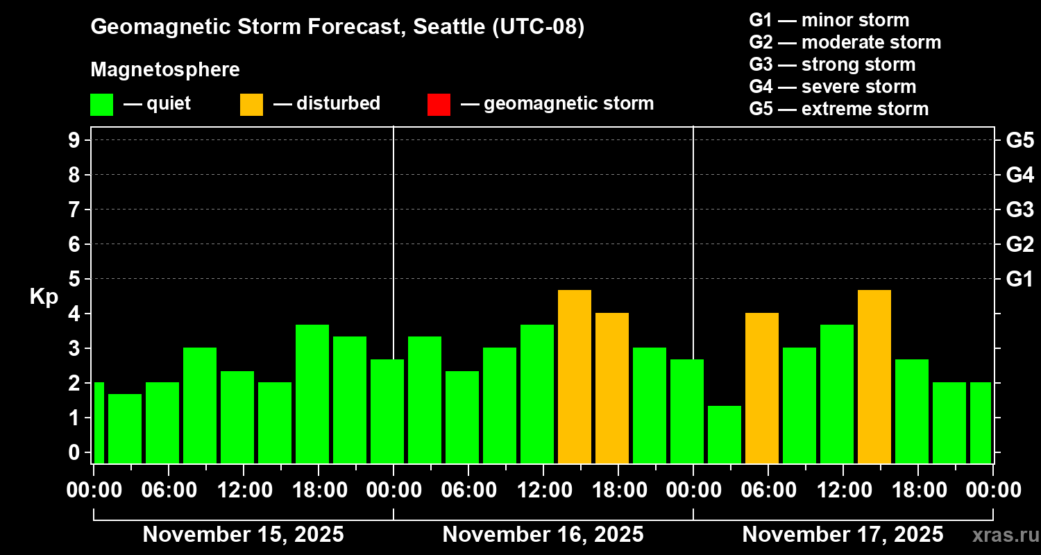 Geomagnetic storm forecast in Seattle for Nov 15, 2025