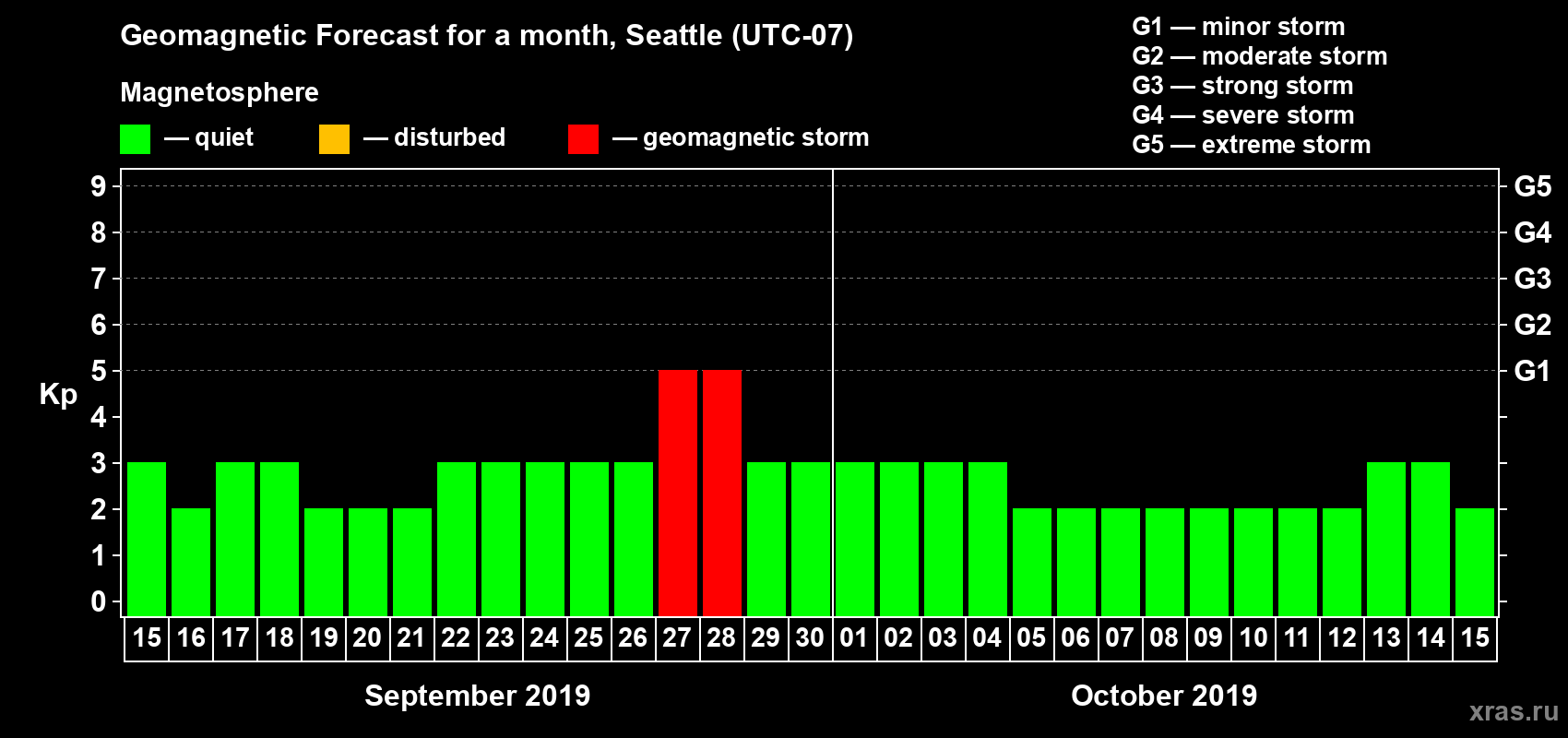 Geomagnetic storm forecast in Seattle for Sep 15, 2019