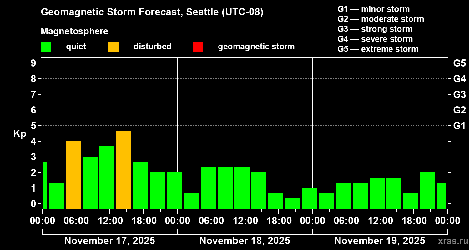 Geomagnetic storm forecast in Seattle for Nov 17, 2025