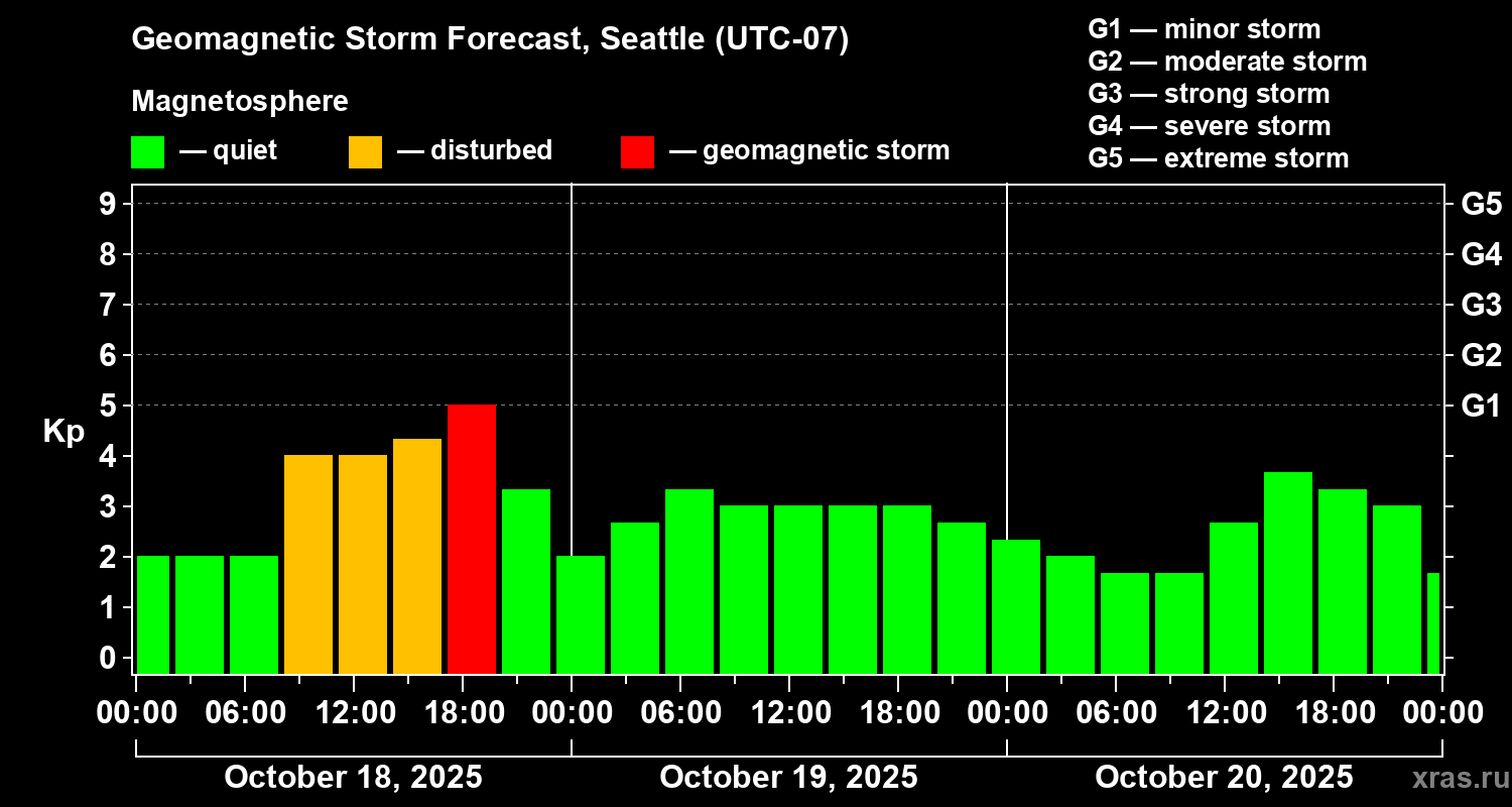 Geomagnetic storm forecast in Seattle for Oct 18, 2025