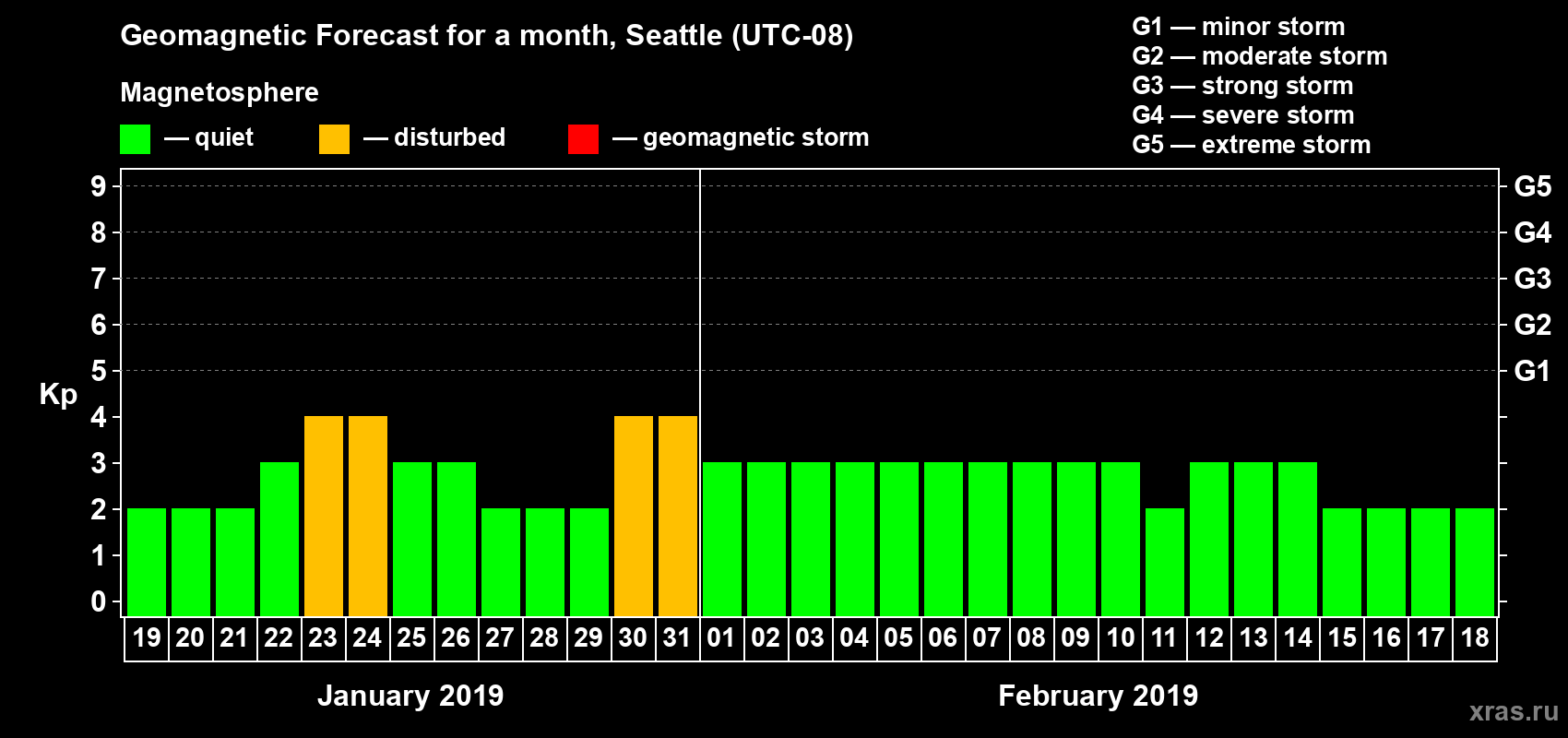 Geomagnetic storm forecast in Seattle for Jan 19, 2019