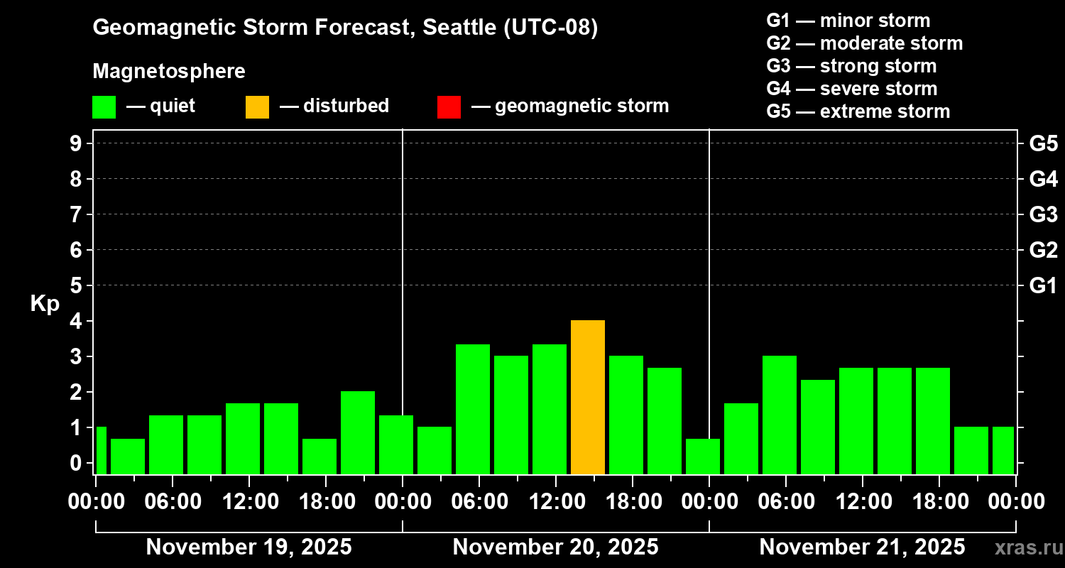 Geomagnetic storm forecast in Seattle for Nov 19, 2025