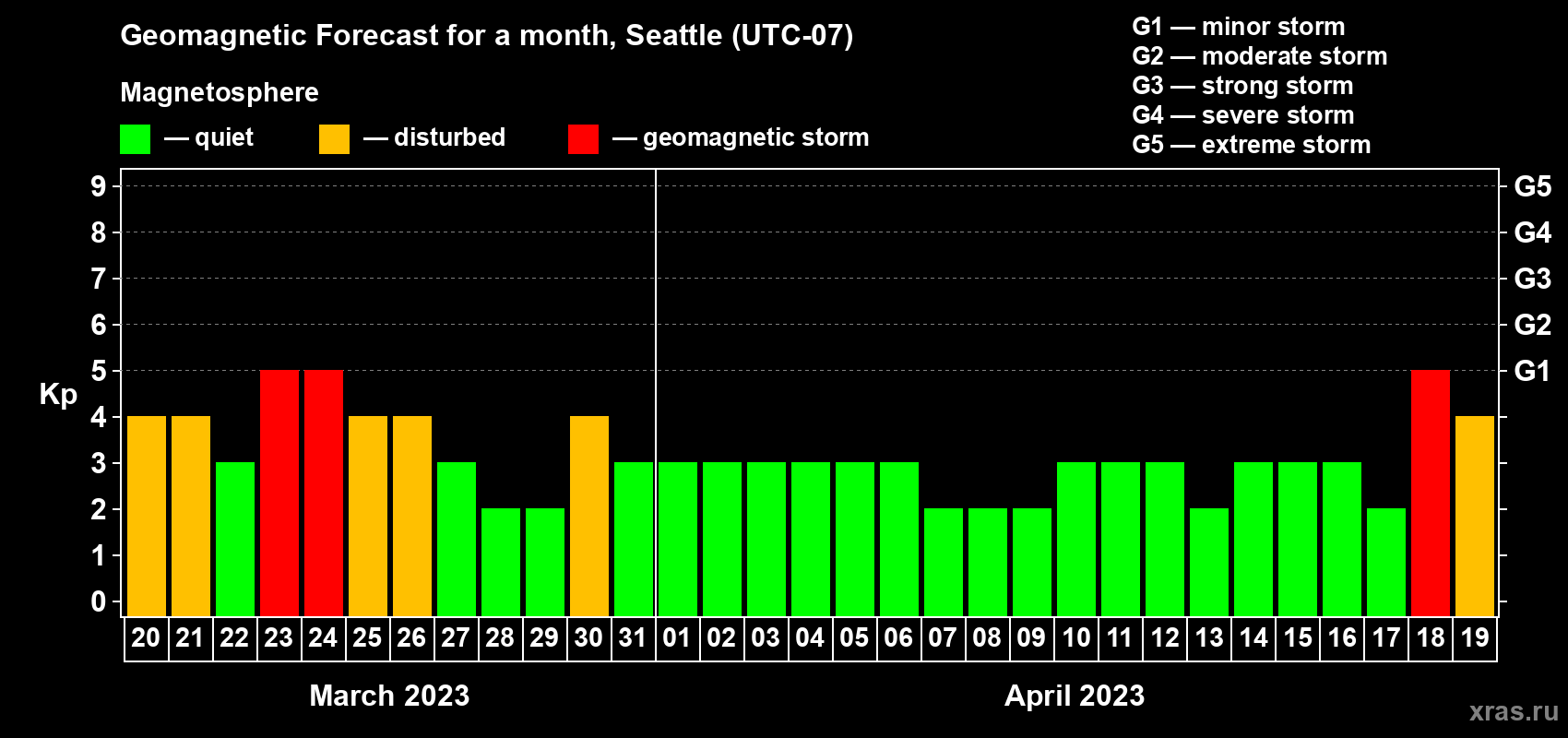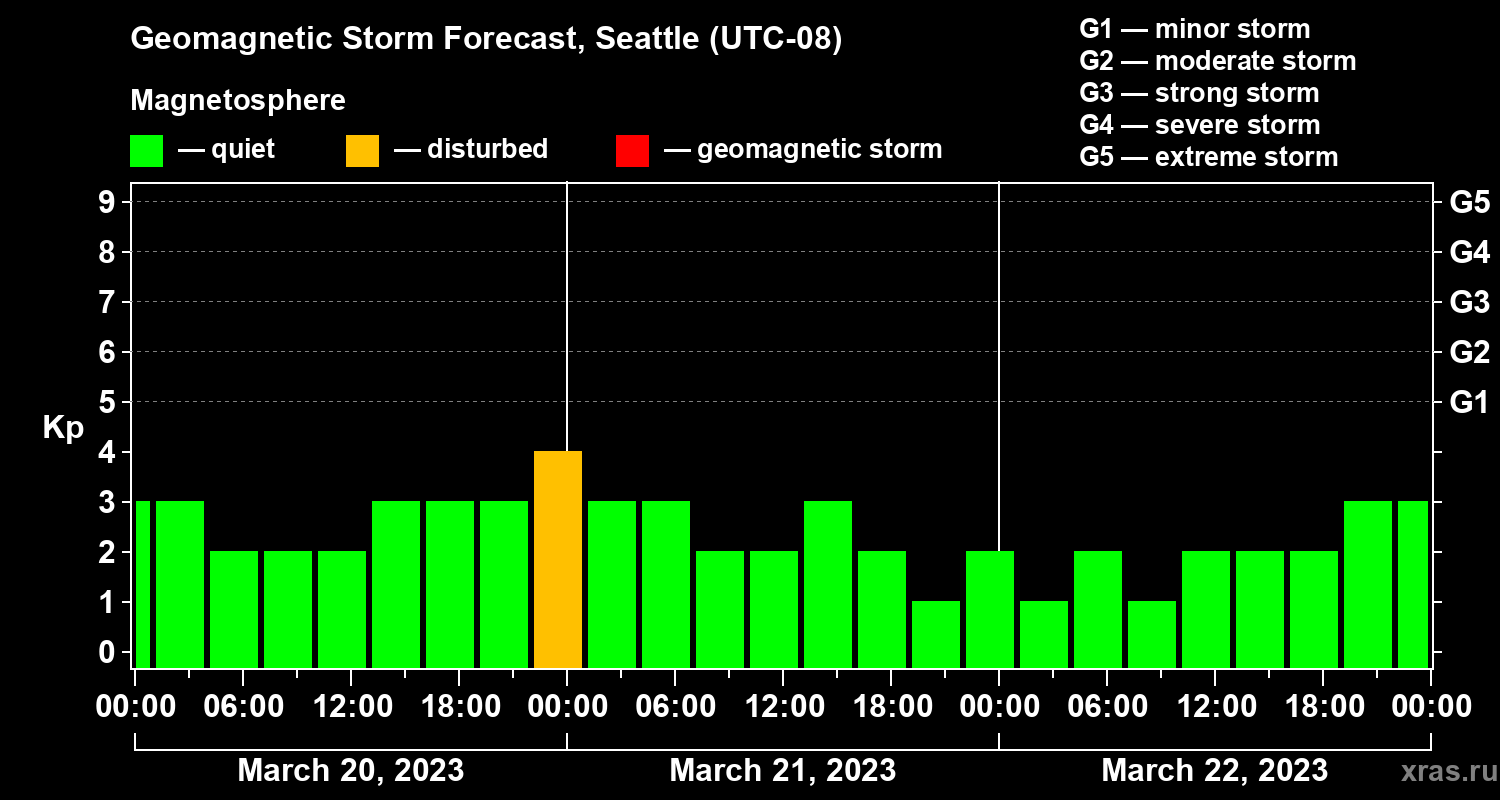 Geomagnetic storm forecast in Seattle for Mar 20, 2023