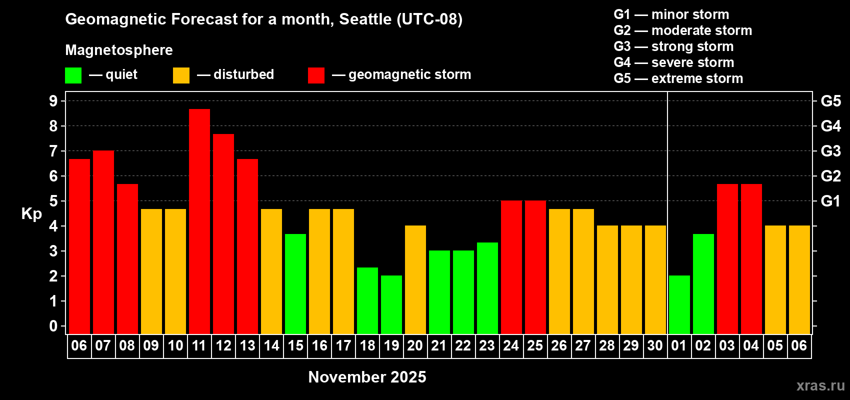 Geomagnetic storm forecast in Seattle for Nov 06, 2025
