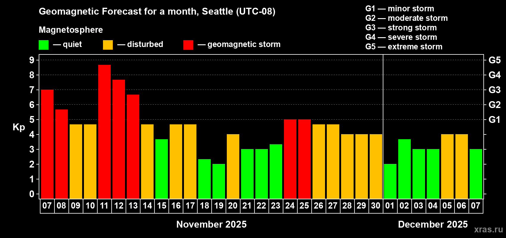 Geomagnetic storm forecast in Seattle for Nov 07, 2025