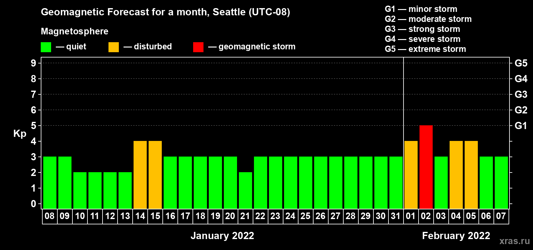 Geomagnetic storm forecast in Seattle for Jan 08, 2022