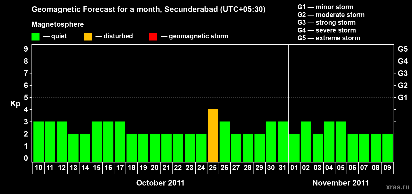 Geomagnetic storm forecast in Secunderabad for Oct 10, 2011