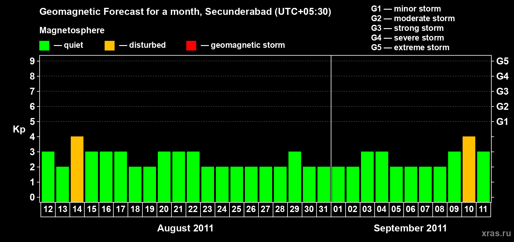 Geomagnetic storm forecast in Secunderabad for Aug 12, 2011