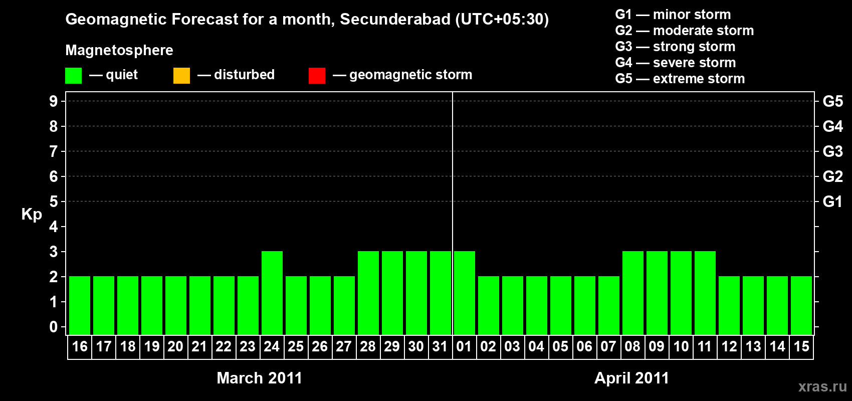 Geomagnetic storm forecast in Secunderabad for Mar 16, 2011