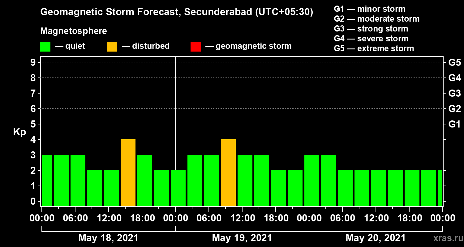 Geomagnetic storm forecast in Secunderabad for May 18, 2021