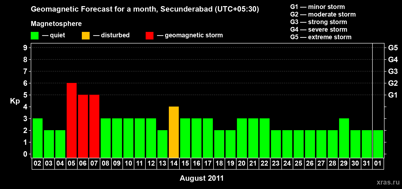 Geomagnetic storm forecast in Secunderabad for Aug 02, 2011