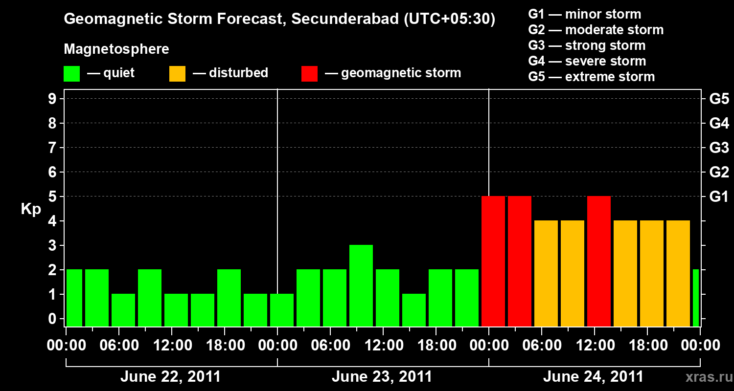 Geomagnetic storm forecast in Secunderabad for Jun 22, 2011