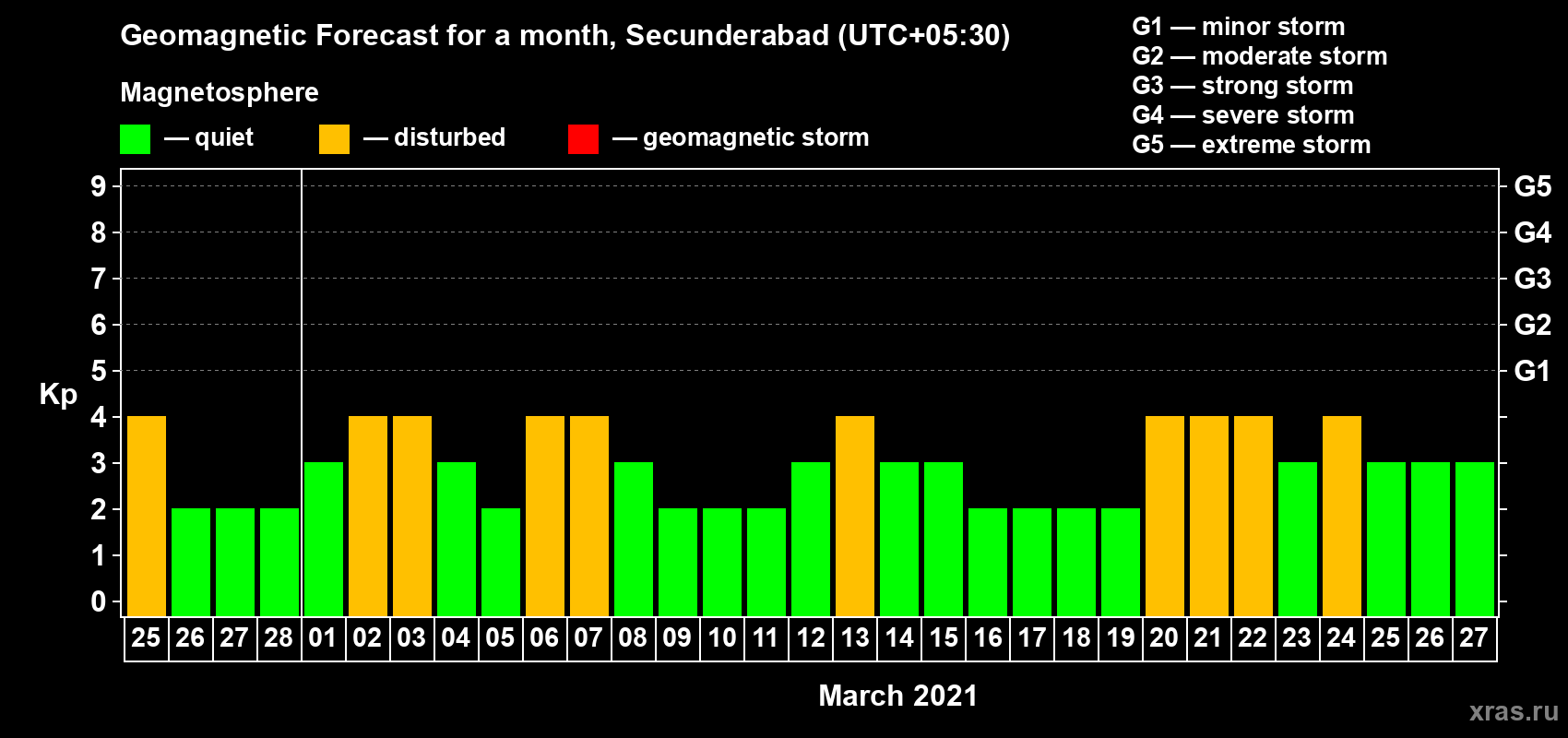 Geomagnetic storm forecast in Secunderabad for Feb 25, 2021