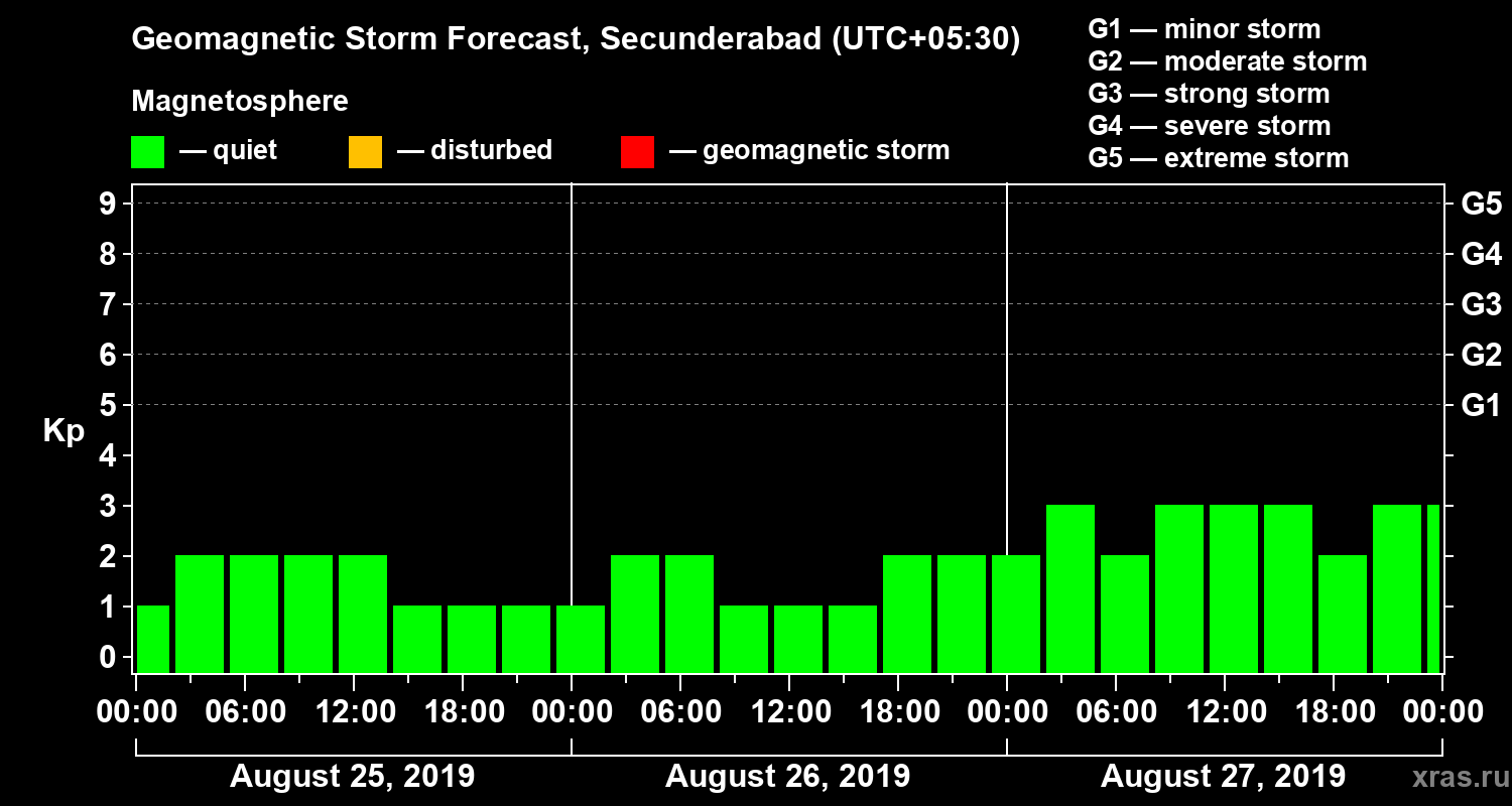 Geomagnetic storm forecast in Secunderabad for Aug 25, 2019