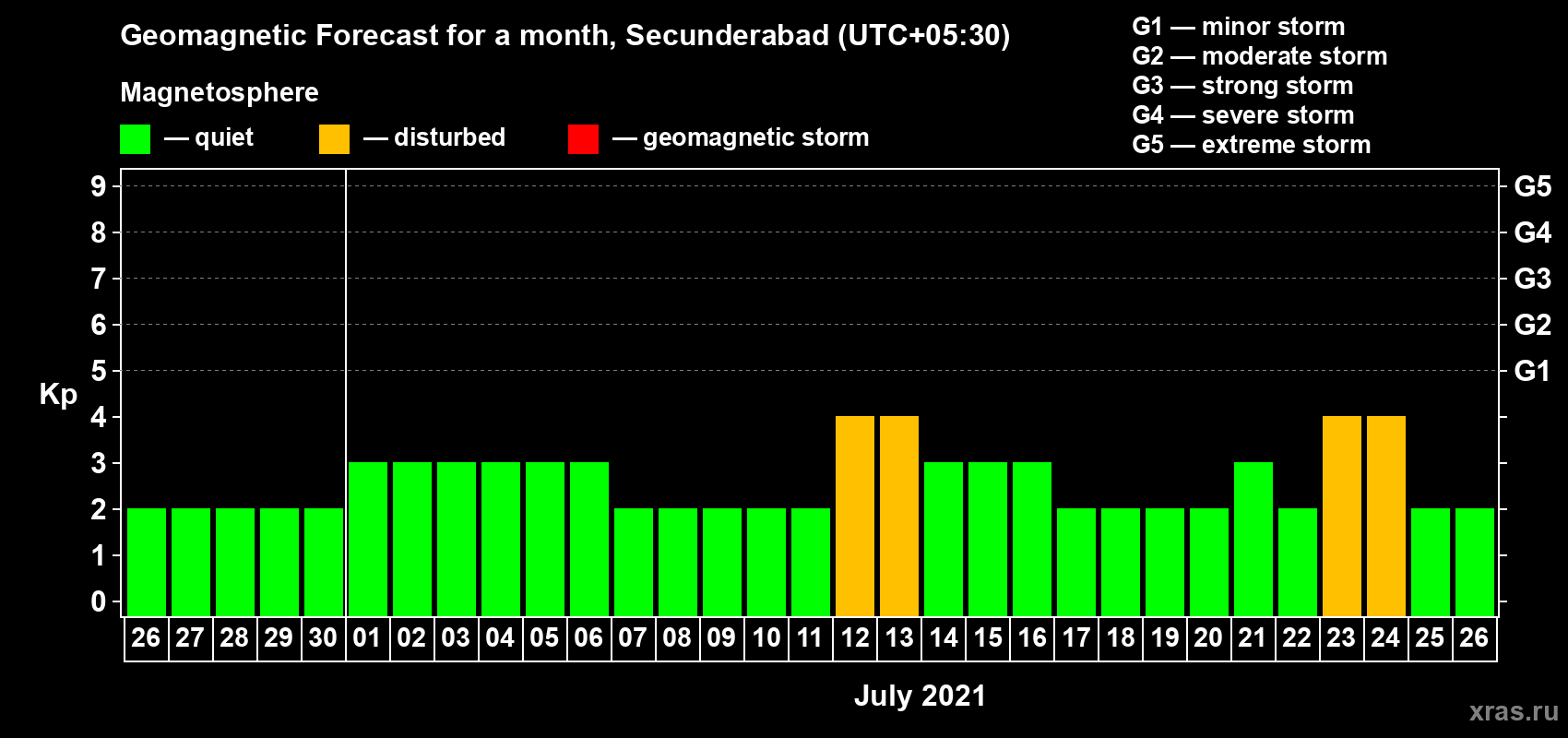 Geomagnetic storm forecast in Secunderabad for Jun 26, 2021