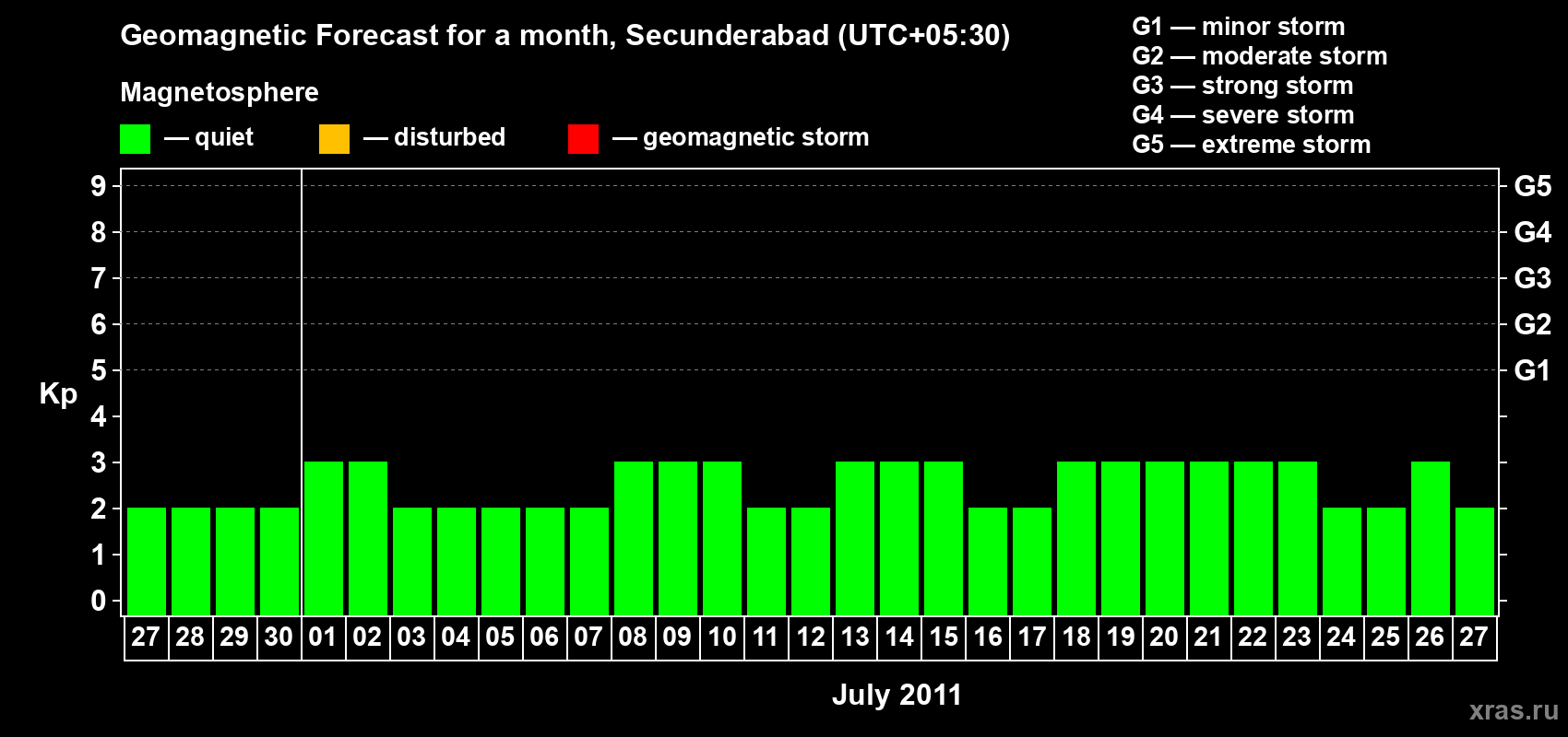 Geomagnetic storm forecast in Secunderabad for Jun 27, 2011
