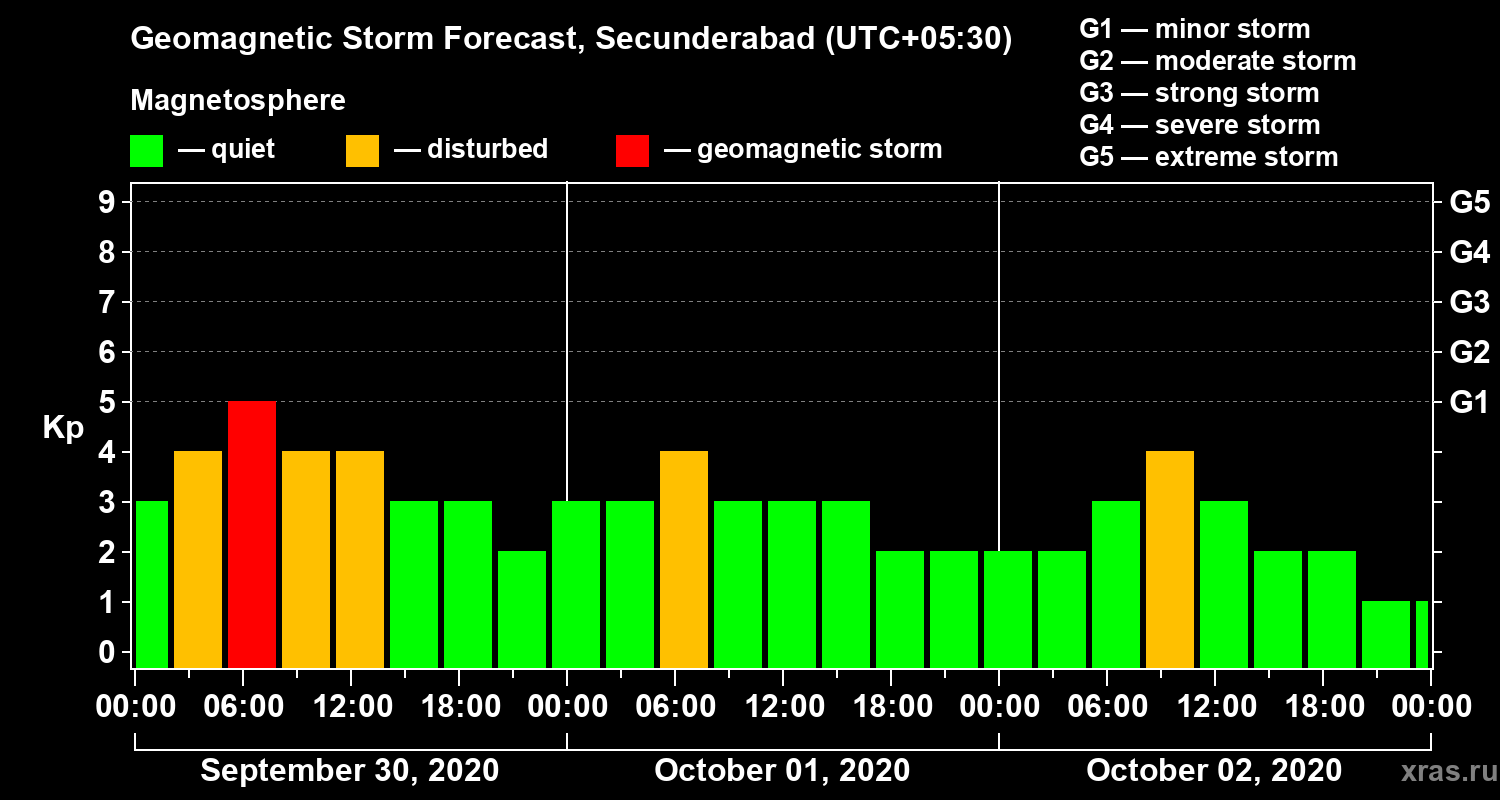 Geomagnetic storm forecast in Secunderabad for Sep 30, 2020