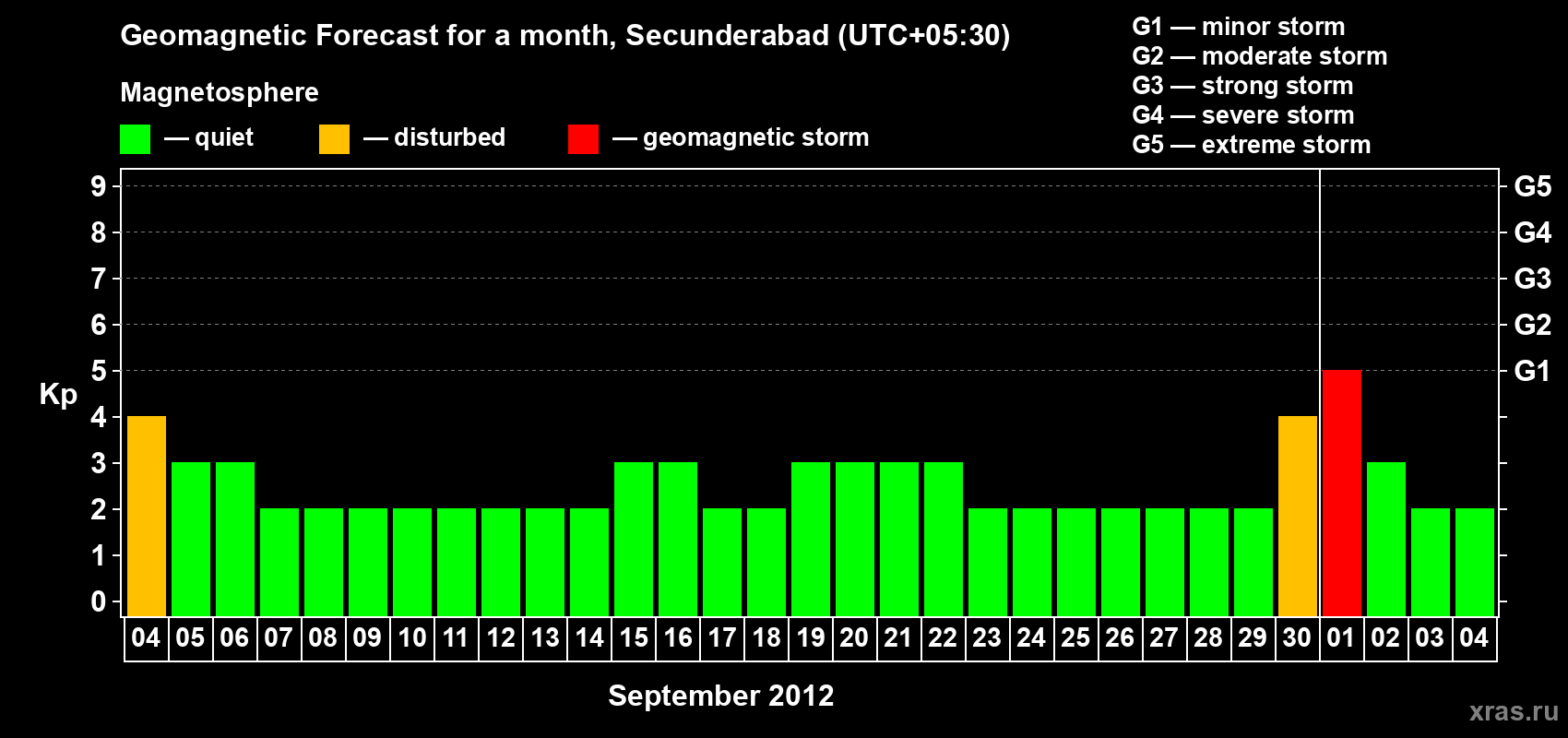 Geomagnetic storm forecast in Secunderabad for Sep 04, 2012