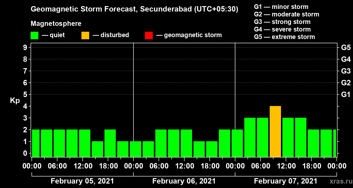 Geomagnetic storm forecast in Secunderabad for Feb 05, 2021