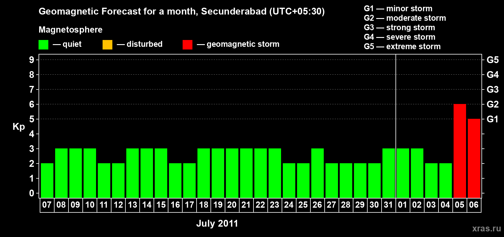 Geomagnetic storm forecast in Secunderabad for Jul 07, 2011
