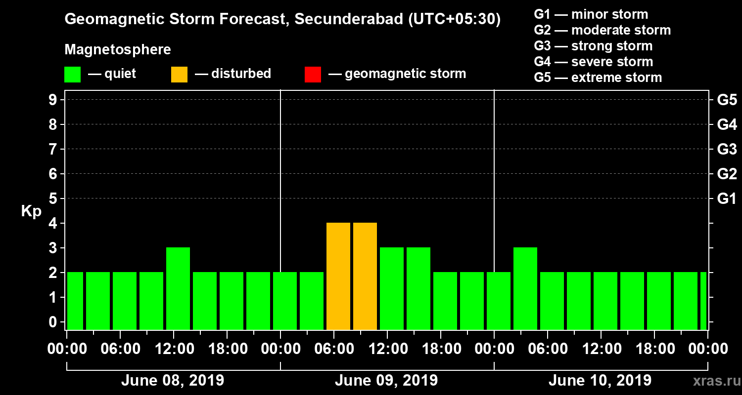Geomagnetic storm forecast in Secunderabad for Jun 08, 2019