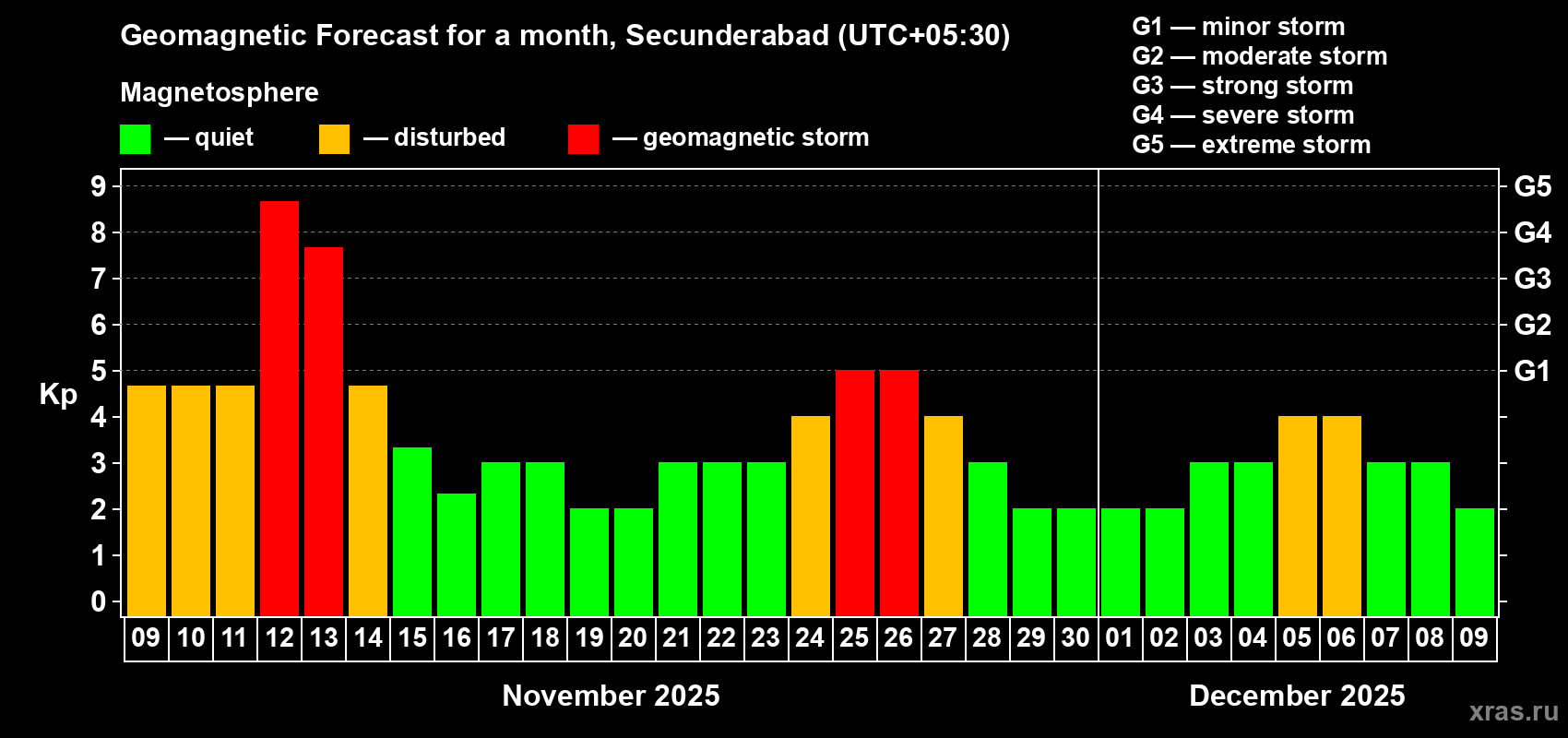 Geomagnetic storm forecast in Secunderabad for Nov 09, 2025