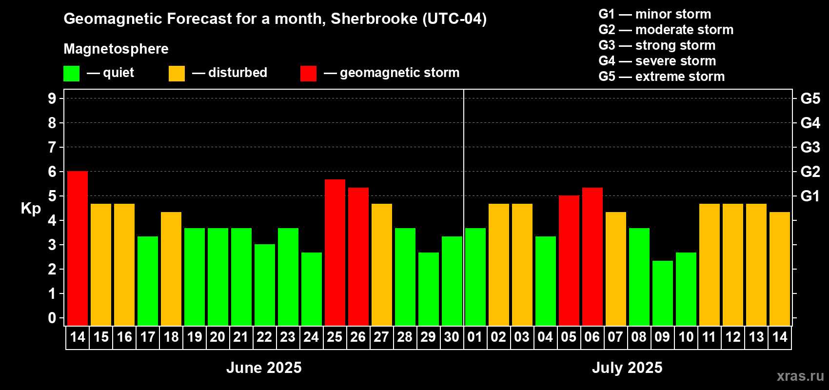 Geomagnetic storm forecast in Sherbrooke for Jun 14, 2025