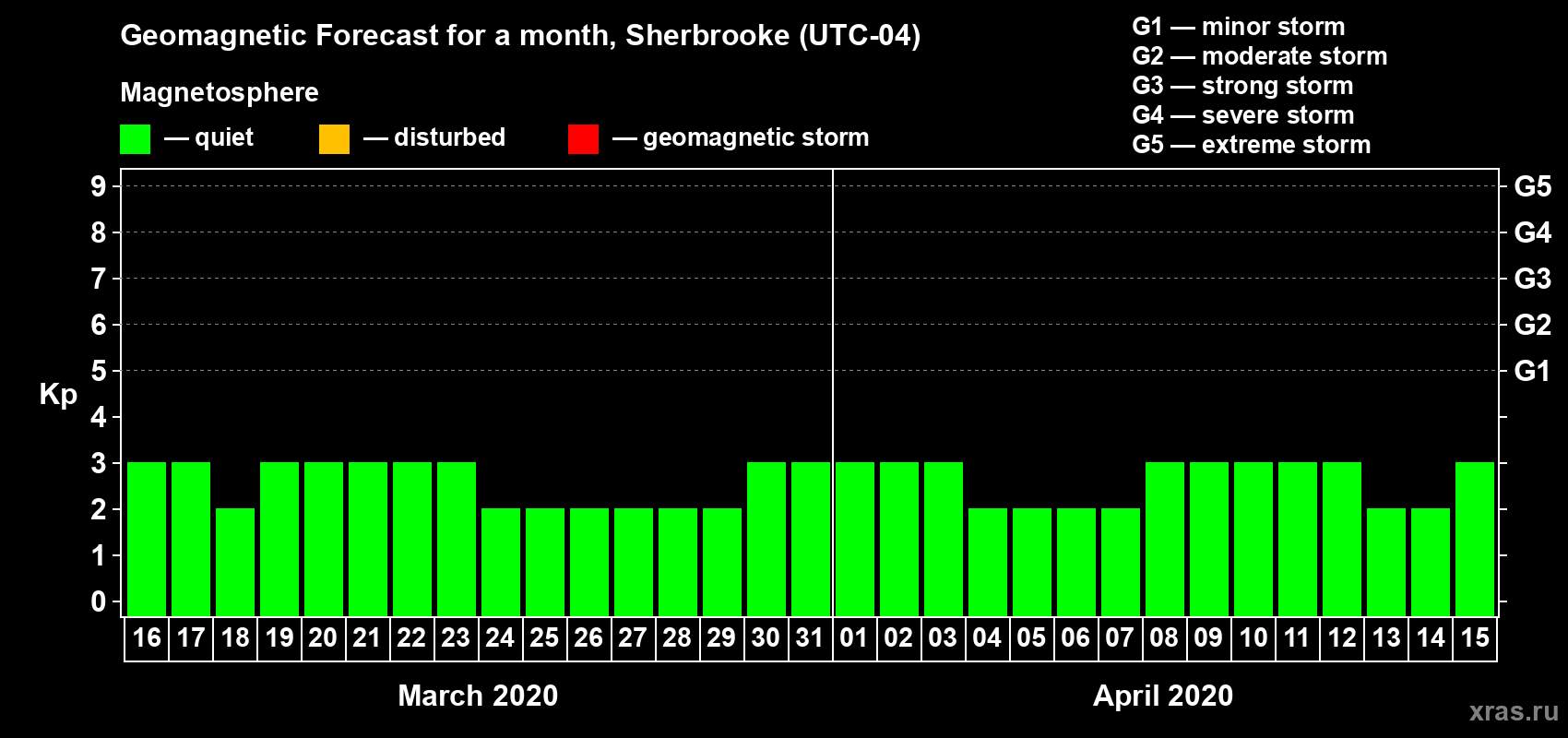 Geomagnetic activity forecast in Sherbrooke — Mar 16, 2020