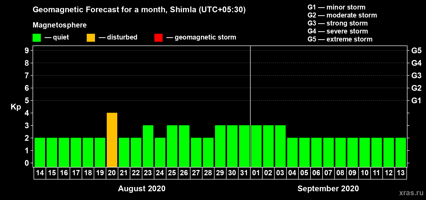 Geomagnetic storm forecast in Shimla for Aug 14, 2020